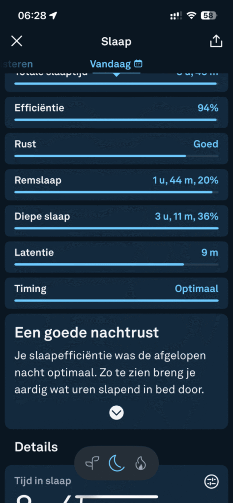 Slaapscore: 95 │ Diepe slaap: 3 u 11 m (36 %) │ REM: 1 u 44 m (20 %) │ Rust‑hartslag: 56 bpm │ HRV: 51 ms
