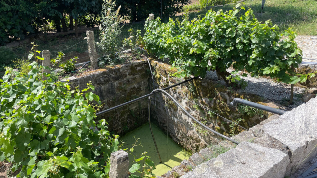 Buiten onmisbaar is deze mijn ook een plaatje om te zien. Gemaakt van dik graniet met een oude granieten zuil erbij waarmee in onze omgeving de aanwezigheid van water wordt aangeduid. Kikkers hebben er een gezellig woonplekje gevonden en de druivenranken groeien er lustig omheen.